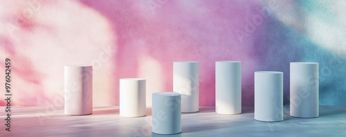 White cylindrical pedestals on colorful pastel background, abstract art and display concept
