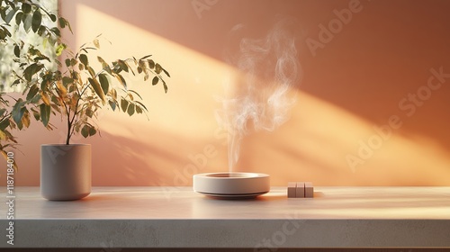 White diffuser with plant, sunlight, and wooden blocks on a table.
