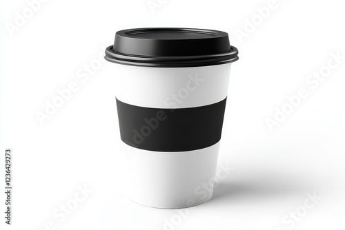 White disposable coffee cup with black lid and sleeve, isolated on white background.