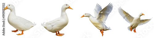 White Domestic Duck PNG Isolated White Background, Pekin Duck Collection, Standing and Flying Waterfowl Set, Farm Poultry Animal Clipart, Aylesbury Duck Element