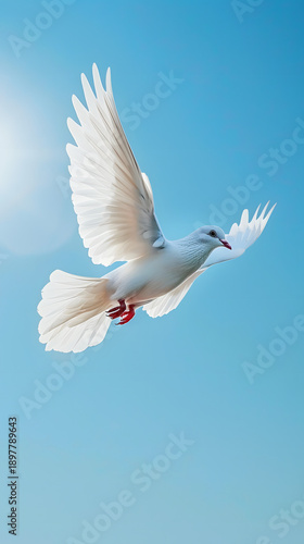 White Dove flying in clear blue sky with sunlight