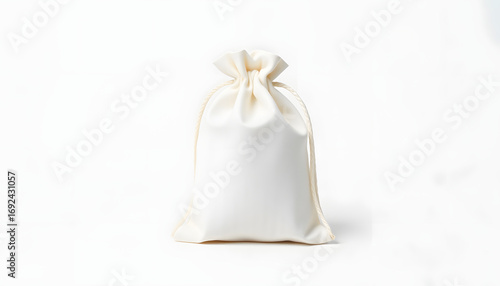 White drawstring bag on white background. Fabric cotton small bag. Isolated pouch, mindfulness theme. White tone