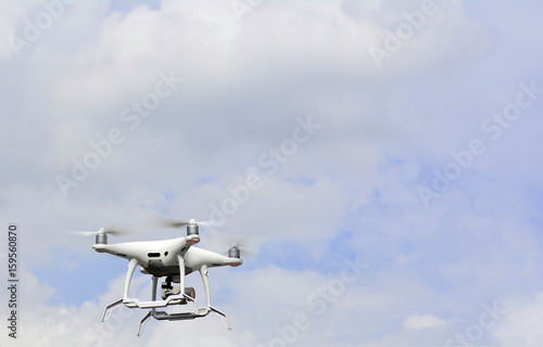 White drone quadrocopter hovers in the blue sky background with modern technology using take a photo and video shooting