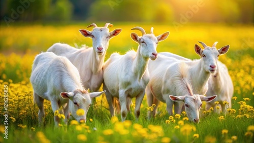 White Dutch goats graze peacefully in a sun-drenched meadow, a long exposure showcasing their serenity.