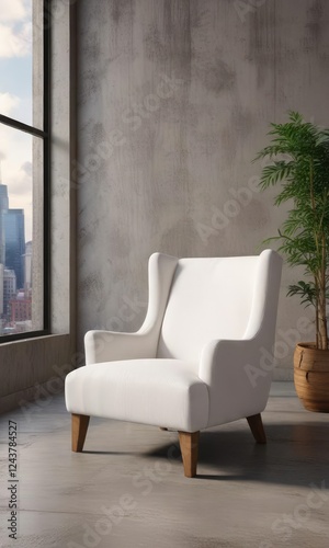 White fabric armchair with wooden legs against urban backdrop, cushioned, sophisticated, home accessories