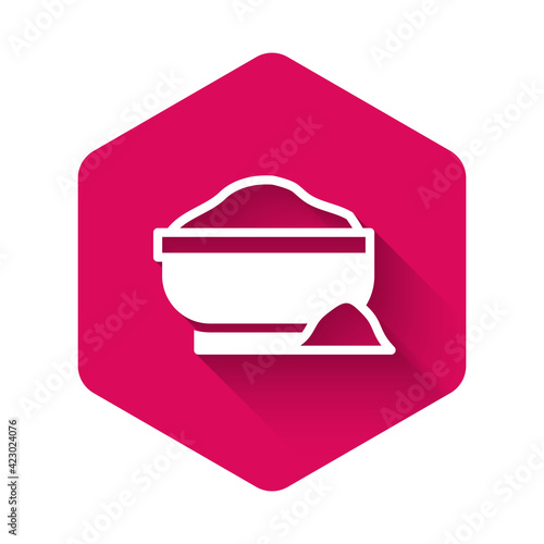 White Flour bowl icon isolated with long shadow background. Baking Ingredients. Healthy organic food. Kitchen utensils cup. Dough cooking. Pink hexagon button. Vector