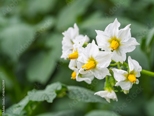 White flower of blooming potato plant. Beautiful white and yellow flowers of Solanum tuberosum in bloom growing in homemade garden. Close up. Organic farming, healthy food, BIO viands, back to nature.