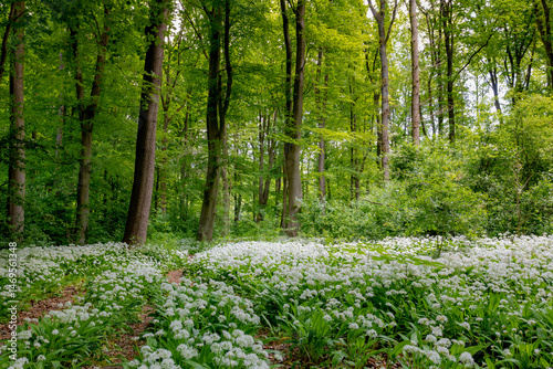 White flowers of Allium ursinum in spring, Ramsons (Daslook) in the forest, Edible wild leek or Wood garlic in Netherlands, Flowering plant in the amaryllis family Amaryllidaceae, Natural background.