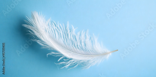 White fluffy bird feather on sky blue background