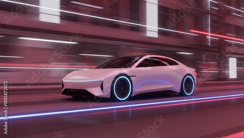 White futuristic electric car driving fast on a highway at night. Autonomous vehicle traveling with neon light trails. Advanced transportation concept.
