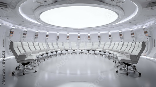 White futuristic room with chairs arranged in a semicircle under a large light.