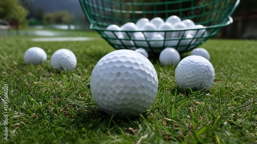 White Golf Balls on Green Grass with Basket. Outdoor Sport and Leisure Game.