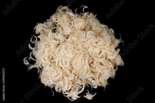 White goose feathers isolated black background. goose feathers and fluff from pillows texture
