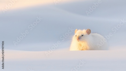 White hamster in snowy field at sunset; winter animal scene