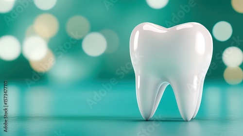 White healthy tooth glowing on blurred turquoise background with copy space