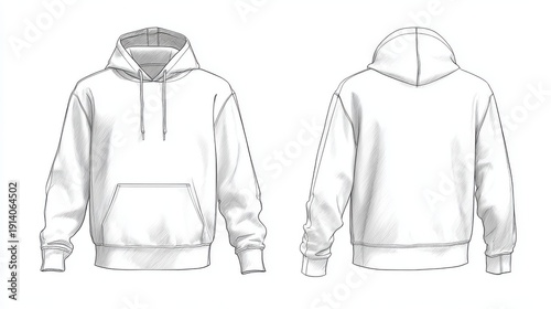 White hoodie technical sketch mockup, front and back views, isolated on white background