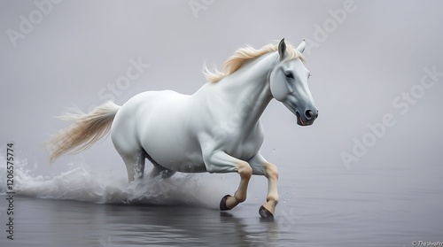 White horse galloping through misty water.