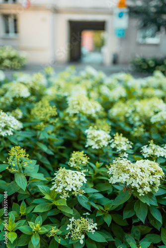 White hydrangea flowers border. Gardening concept.