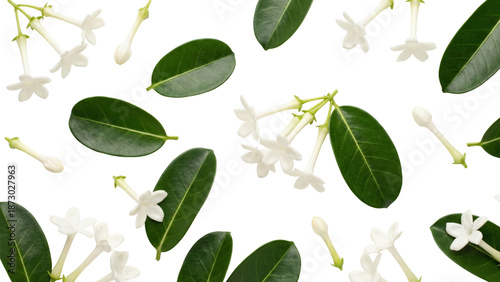 White Jasmine Flowers and Green Leaves Seamless Pattern on White Background