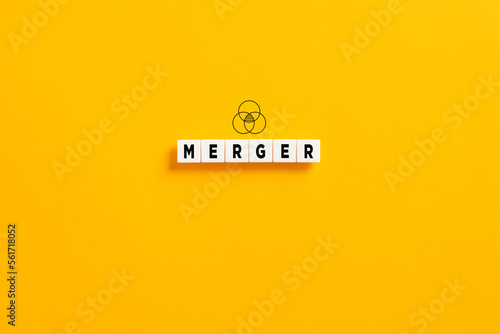 White letter blocks on yellow background with the word merger. Business company merger concept.