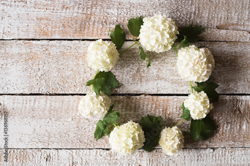 White lilac wreath laid on wooden table. Studio shot.