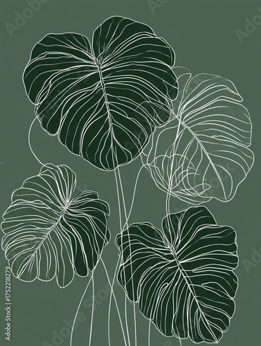 White line art outlines of monstera leaves cascade down a deep, solid green background, creating a minimalist tropical design.