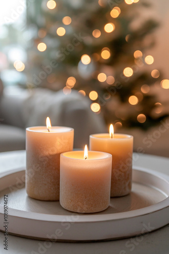 white lit candles on a ceramic tray with blurred christmas tree in the background