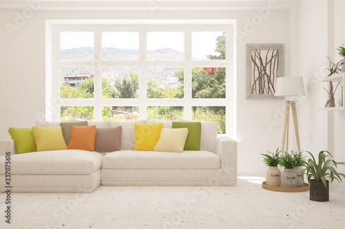 White living room with sofa and summer landscape in window. Scandinavian interior design. 3D illustration