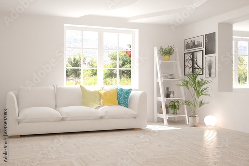 White living room with sofa and summer landscape in window. Scandinavian interior design. 3D illustration