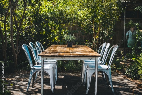 white Metal Table wooden table face With 6 Chairs Outdoor In The Home Garden