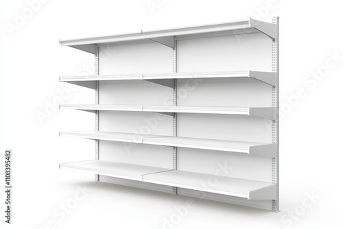 White metal wall-mounted shelving unit with adjustable shelves on white background