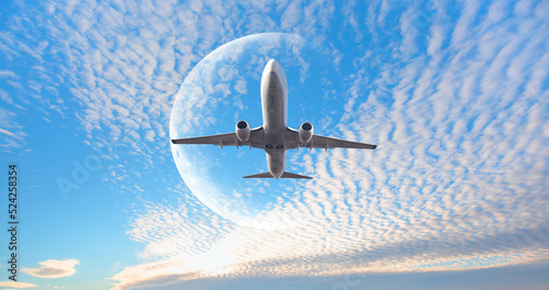White passenger airplane in the sky with full moon - Travel by air transport "Elements of this image furnished by NASA"