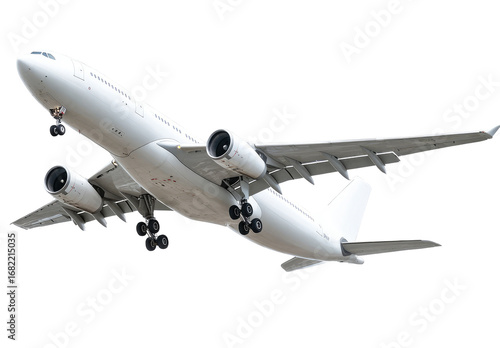 White passenger jet in flight, high-angle view. Large, commercial airliner, taking off, engines visible
