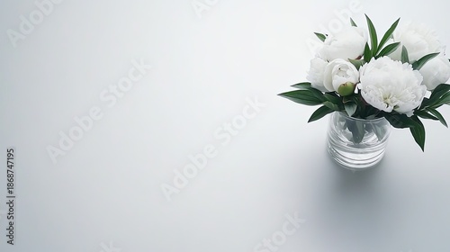 White peonies bloom gracefully in a glass vase, showcasing soft lighting against a clean, neutral background, reflecting a modern aesthetic