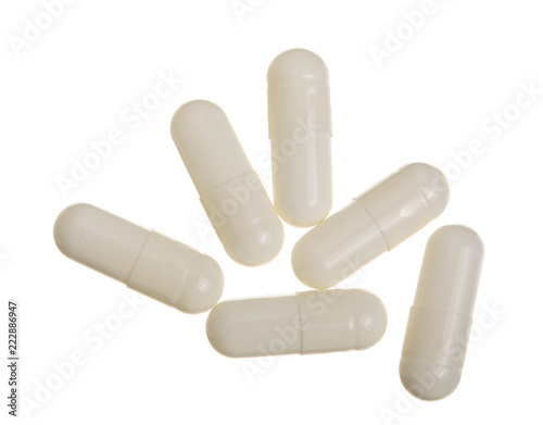 white pill capsule isolated on white background. Top view. Flat lay