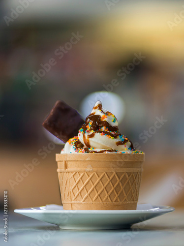 White plate with ice cream dessert in wafer cup with chocolate cookies and creative decoration topping on blurred colorful interior background.