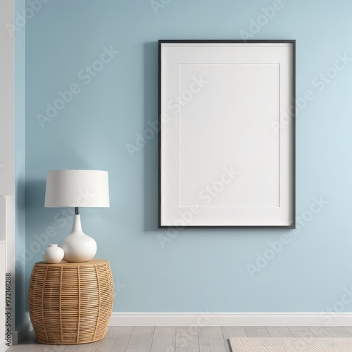 white poster frame close up in modern home interior with light blue colored walls, wall mockup, 3d rendering