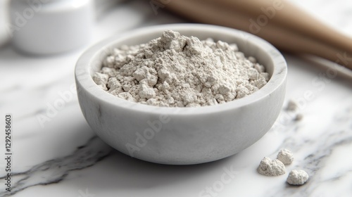 White powder in small bowl on marble surface with rolling pin and jars in background