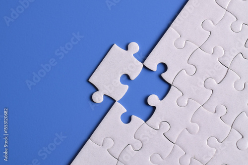 White puzzle pieces on blue background. Flat lay. Top view