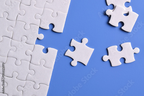 White puzzle with missing piece on blue background. Flat lay. Top view
