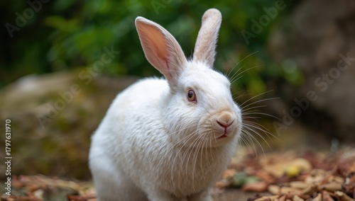 White rabbit eating in a zoo, focus on animal behavior and habitat