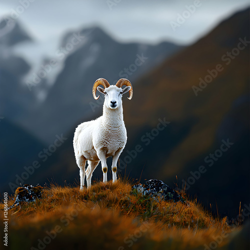 White Ram on Autumn Mountain Peak