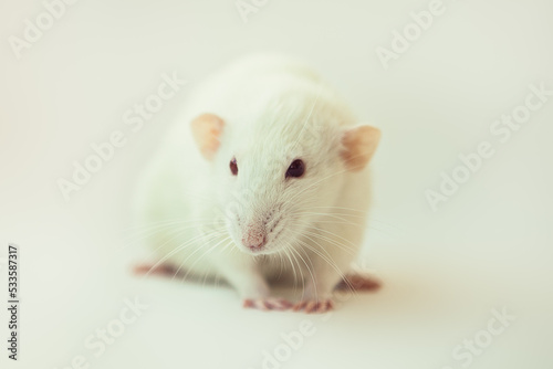 White rat dumbo with red eyes on white background. Laboratory rodent.
