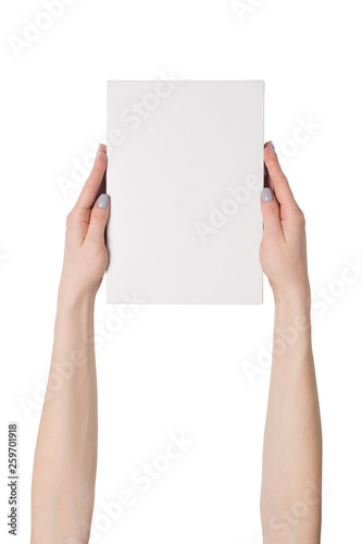 White rectangular box in female hands. Top view. Isolate