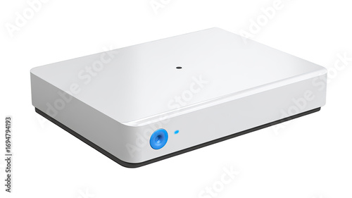 White rectangular box, slightly angled, with light blue accents. Flat top and bottom. Small, round light-blue dot on front, possibly indicator. Simple, modern design