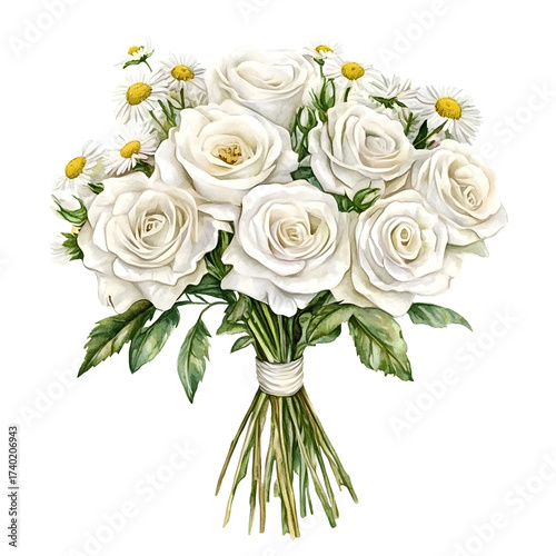 White rose bouquet with chamomile flowers, beautifully illustrated in watercolor style, showcasing delicate petals and lush greenery, perfect for wedding themes and floral design concepts
