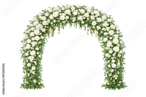 White rose wedding arch arrangement with green foliage, elegant ceremony backdrop for marriage proposal or event decor