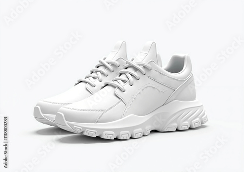 White Running Sneakers with Detailed Stitching and Treads on White Background