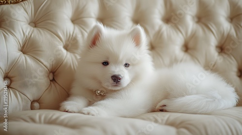 White Samoyed puppy poses on luxury vintage cream sofa with tufted details and golden accents. Diamond collar adds elegance while natural lighting creates warm, dreamy atmosphere.