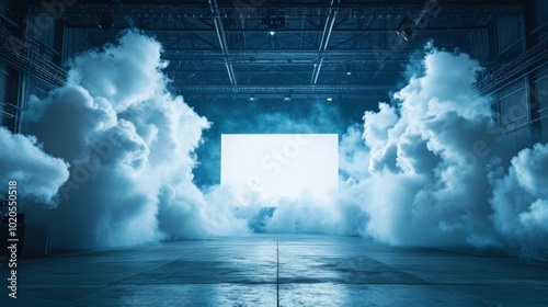 White Screen Illuminated by Blue Light in a Foggy Warehouse
